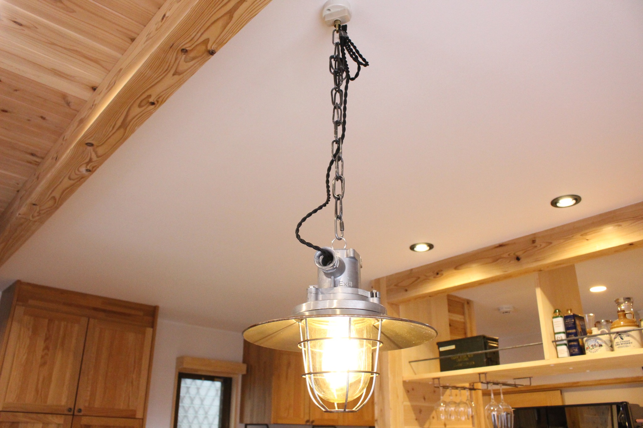 ビンテージライトやペンダントライトなどで重量がある照明はチェーンなどの鎖が付いており、その鎖をフックなどに引っ掛けて使用する場合があります。下記の写真のような感じです。