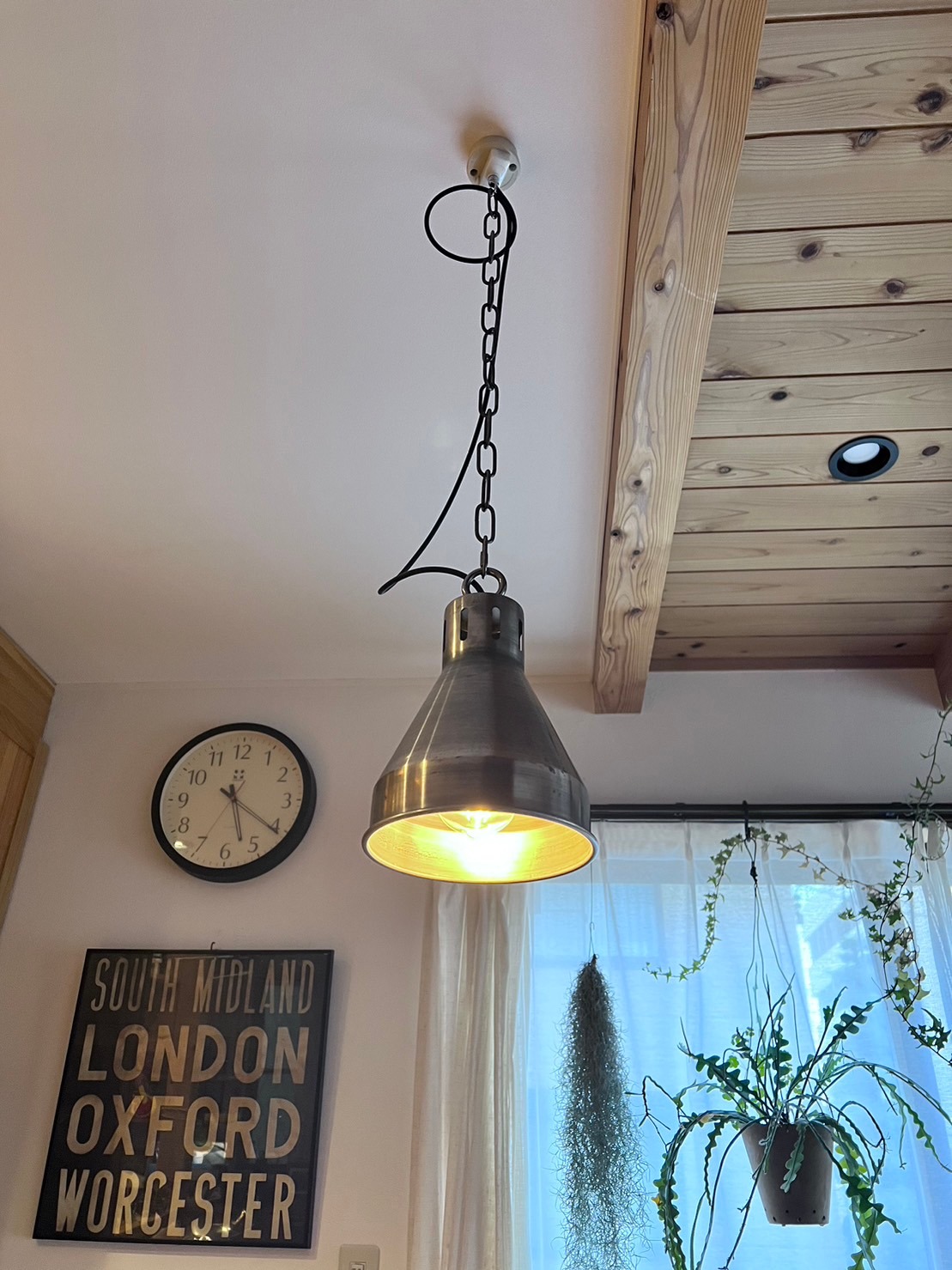 付属のチェーンと照明コードを組み合わせれば、天井高や家具の配置バランスに合わせて簡単に設置ができます。チェーンは1.5m、コードは1.2mと余裕を持たせた長さ設定のため、吹き抜けや高天井の空間にも余裕をもってご利用いただけます。