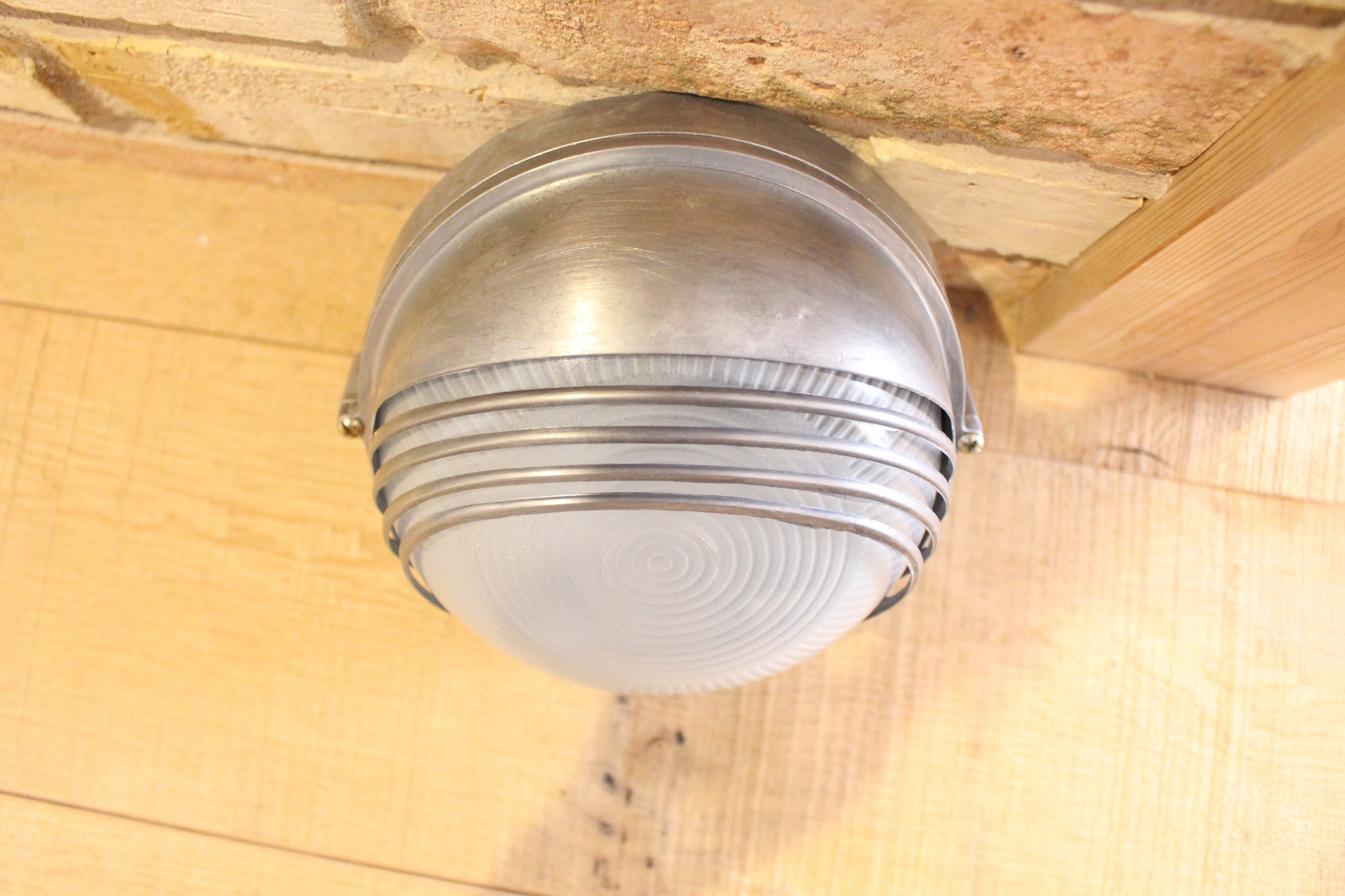 カバーには強度の高いガラスを採用。ガラス表面には繊細なリブ模様が施され、光が屈折・拡散することで、直接光の眩しさを抑えつつ、柔らかく奥行きのある光を生み出します。点灯時には、光がガラスの曲面を伝い、壁や天井に美しい陰影を描き出します。これは単なる照明効果ではなく、空間演出の一部として計算された光の表情です。