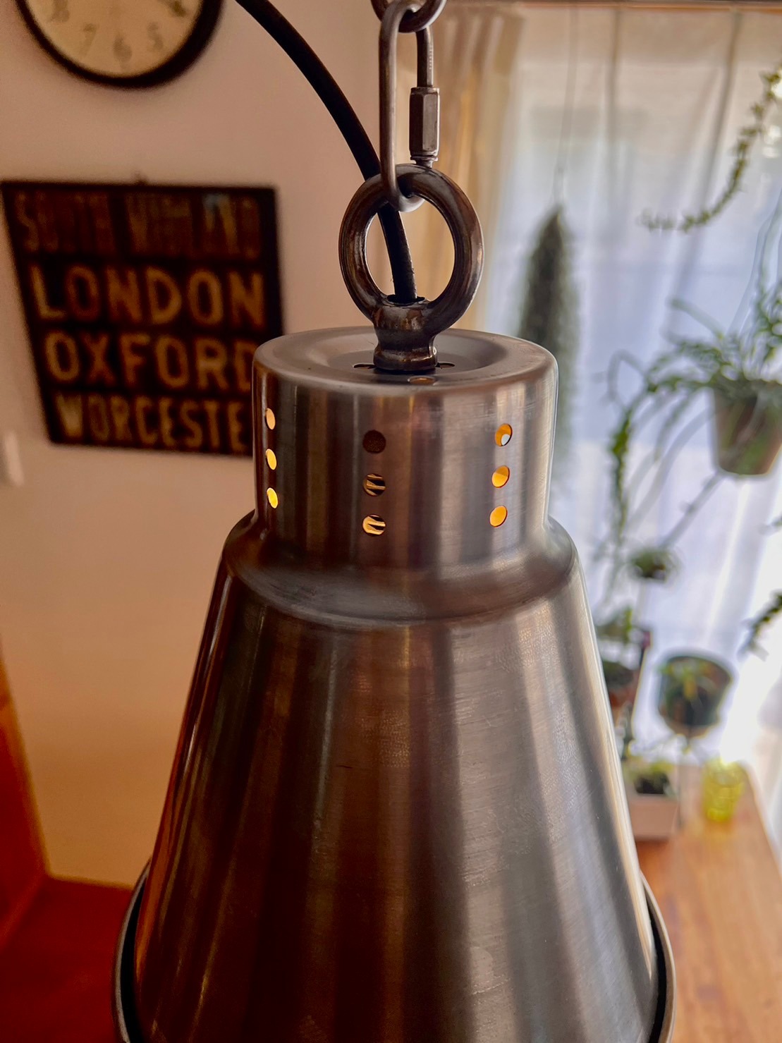 鉄製のシェードは、音を吸収する布製や木製のインテリアとは異なり、空間にわずかな反響を生み出します。これが、静かな部屋に微かな緊張感を与え、空気の密度を変えるような感覚をもたらします。照明が「音」や「空気」とも関係しているという視点は、感性豊かなユーザーに響くポイントです。