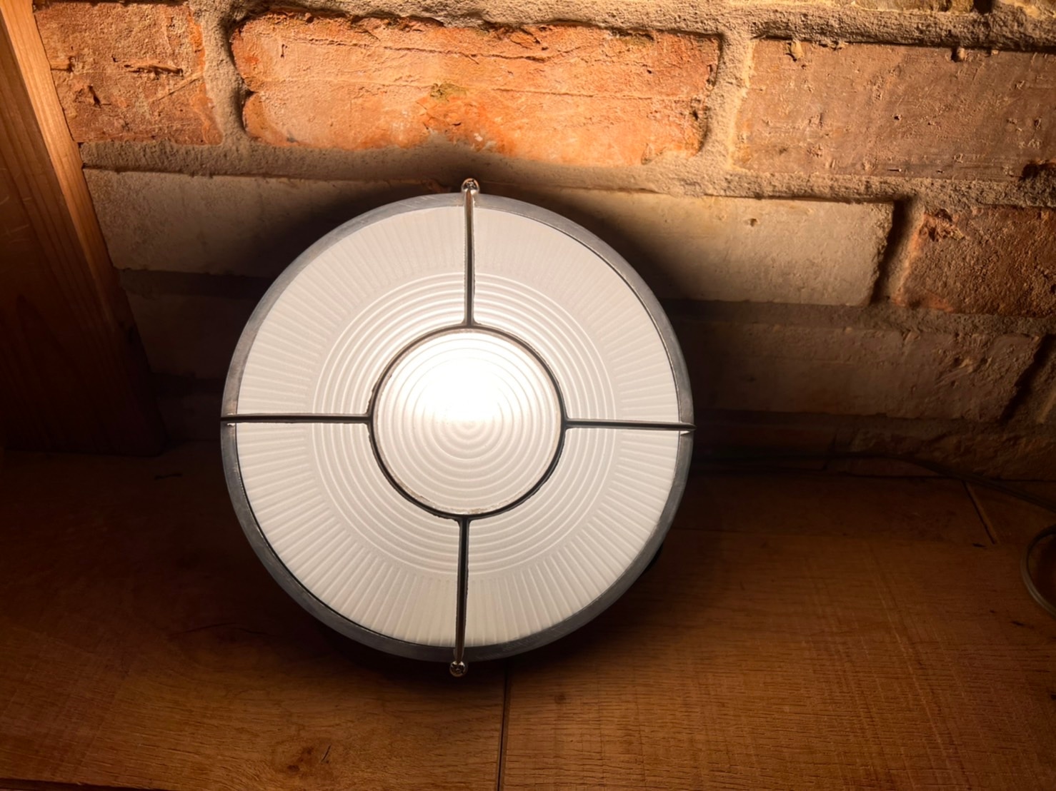 カバーにはガラスを使用し、内部の光を均一に拡散。リブ状のディテールが光を分解し、壁や床に柔らかな陰影を描きます。
