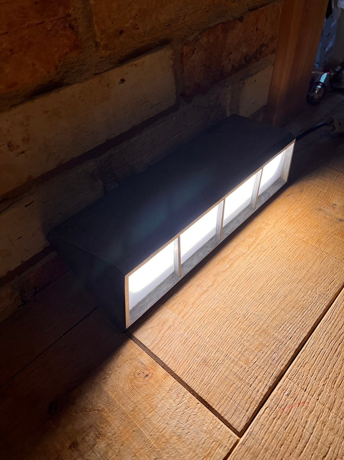 特徴的なエッジカットの本体に4つのセクションを備え、点灯時には美しく分割された光のグラデーションが壁面に陰影を描き、空間に深みと高級感を演出。廊下・玄関・階段・リビングはもちろん、ショップやカフェなどの商業空間のアクセントライトとしても理想的です。