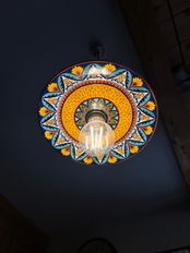 陶器シェードに描かれたロゼットや花模様は、単なる表面装飾ではありません。光が内部から放たれると、釉薬の粒子と彩色の濃淡が階層的に反応し、模様が浮き上がるように見えます。特にテーブル面から下向きに覗いたとき、シェード越しの色彩が反射してテーブル上や天井に柔らかな輪郭を作り、模様の「影」が空間に広がることで立体的な深みが生まれます。昼の鮮やかさと夜の内発的な輝きが混在する、この二面性こそがタラベラランプの最大の魅力です。
