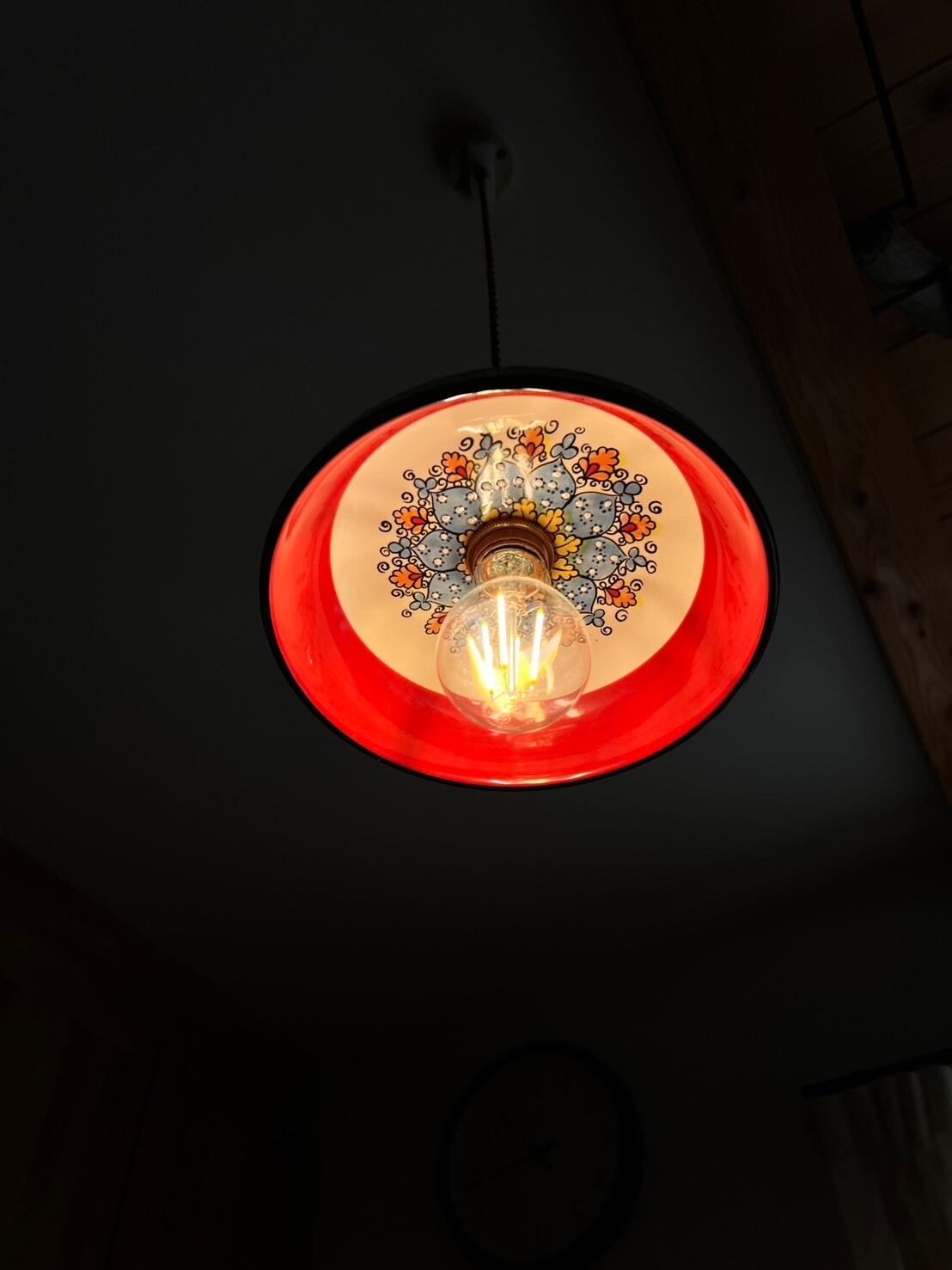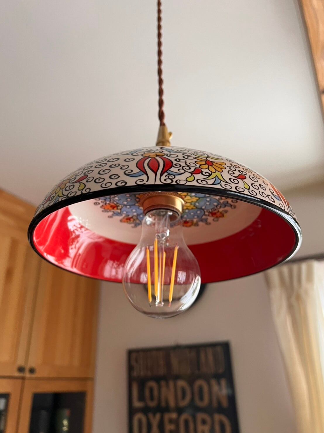 下から見上げると、アルボレ・ビータの陶器シェードは強烈な赤を中心に、淡い水色、明るい黄色、温かなオレンジの花模様を透かして輝きます。釉薬の層が光を受けて色彩の階層を際立たせ、テーブル面や顔まわりに柔らかな陰影と色の余韻を落とすため、ただの照明が瞬時に情景を絵画へと変えます。燃えるような赤が空間の視線を一点に集め、花の軽やかな色合いがその強さを和らげて温かさと華やかさを同時に生み出します。夜の食卓や小さなコーナーに吊れば、日常が特別な時間へと移ろう演出を確約する、一灯で空間を物語るランプです。