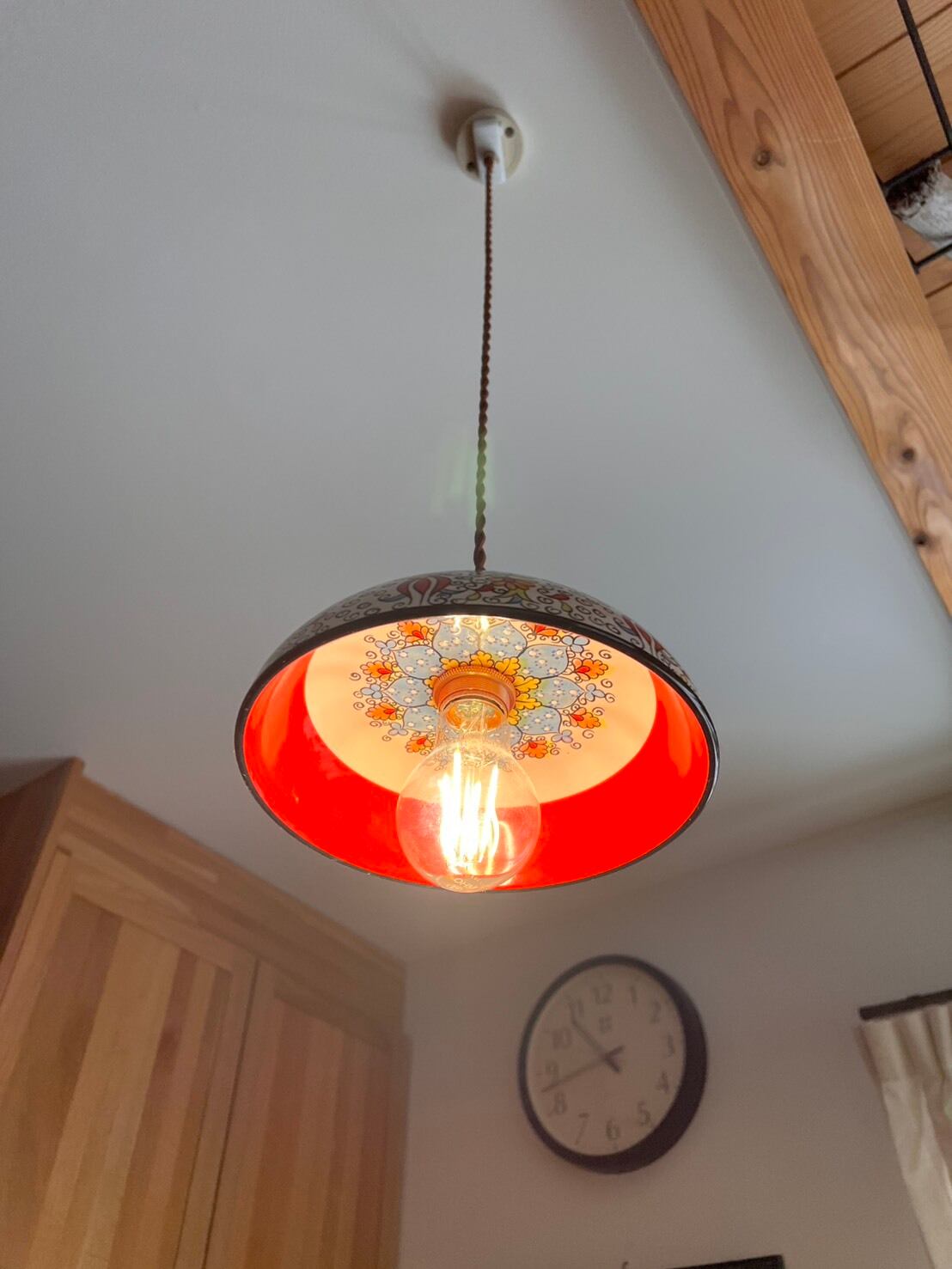 このペンダントは主役ライトとしてだけでなく、アクセントとしても機能します。ダイニングではシェード下端をテーブル面から65〜75cmの位置に取り付けることで、食卓に穏やかな陰影と色彩の反射を生み出し、会話と料理の見え方を豊かにします。玄関や廊下、トイレで使えば短時間でも深い印象を残せます。カフェやブティックのアクセント照明としても、商品や席まわりに温かさと個性を添える装置になります。